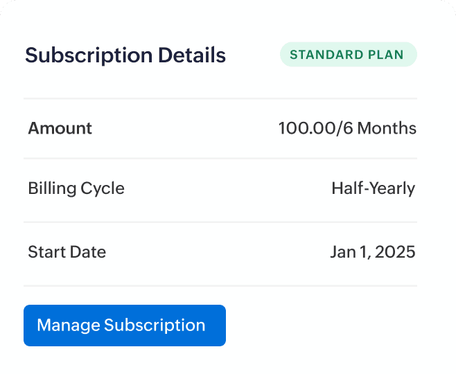 Customers charged via Zoho Billing can also view their subscription plan details and payments on the same customer portal.